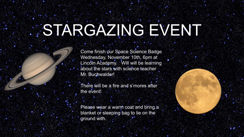 We will have a busy first meeting Wednesday, September 15th from 5:30 – 6:45pm. Please be on time and prepared to have fun. I have the annual permission slip I need signed by parents and we will quickly go over the fall product sale information, meeting dates and dues. We will be doing tie dye so war something messy! Thank you! See you soon!